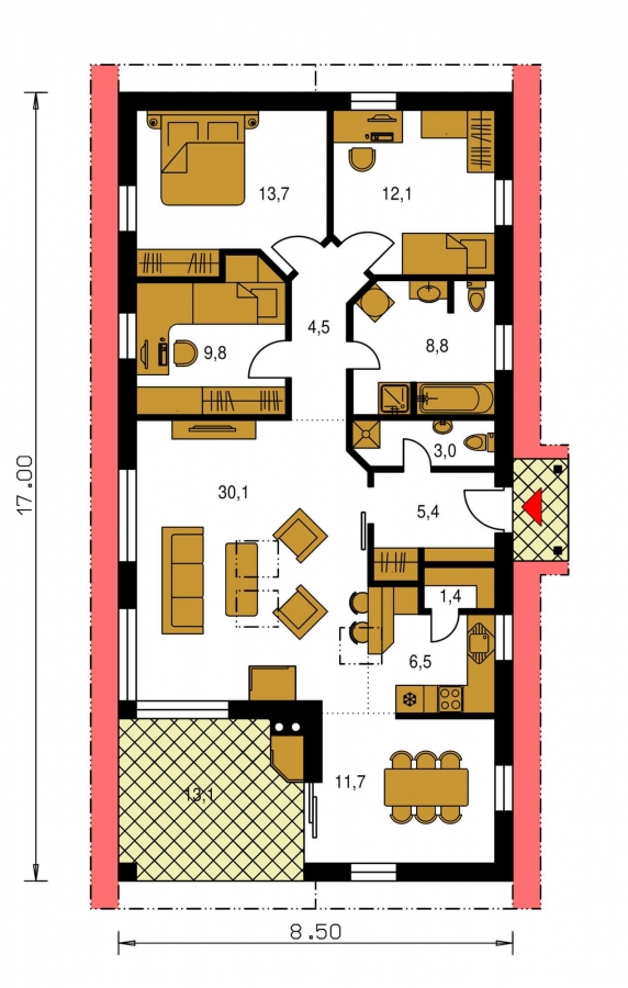 A portico over the main entrance provides you with comfort when entering the house. After you enter the inside, you get to a vestibule, where clothes rack, or other furniture for storing clothes can be placed. You can also situate a built-in wardrobe here. From the rest of the house, the vestibule is separated by a space-saving sliding door. It contributes to the effort of saving your heating expenses and prevents the dust and noise from the outside from entering the inside.
