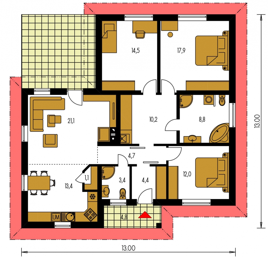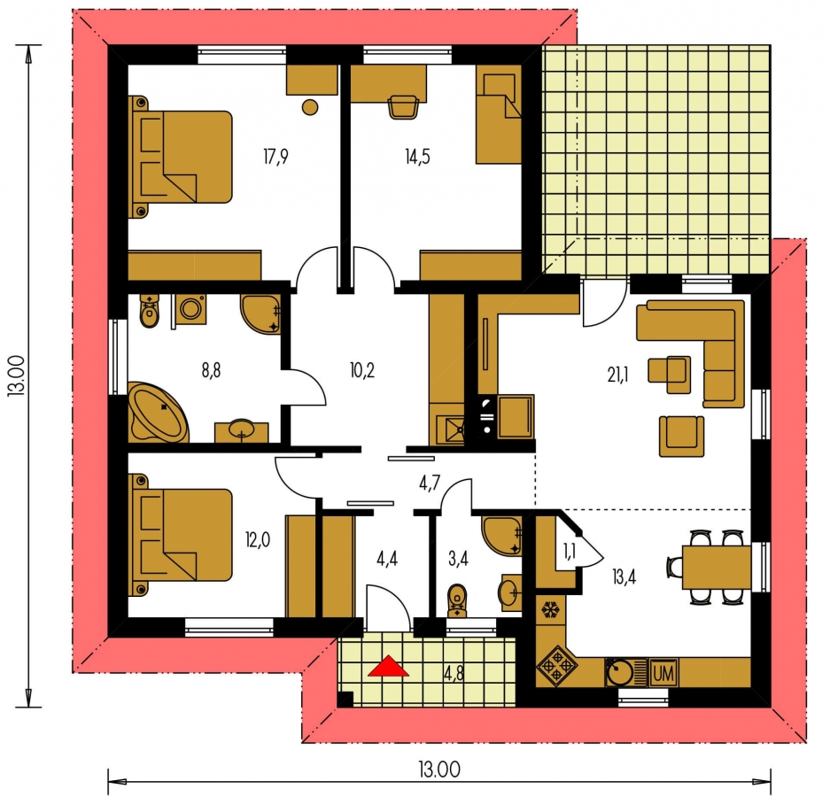 Are you interested in L-shaped houses and looking for a suitable catalogue project? Then the four-bedroom bungalow with terrace Bungalow 134 is worth your attention. This family house will also fulfil your requirements for space to store things. Housewives will be pleased with the pantry in the kitchen.