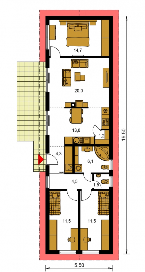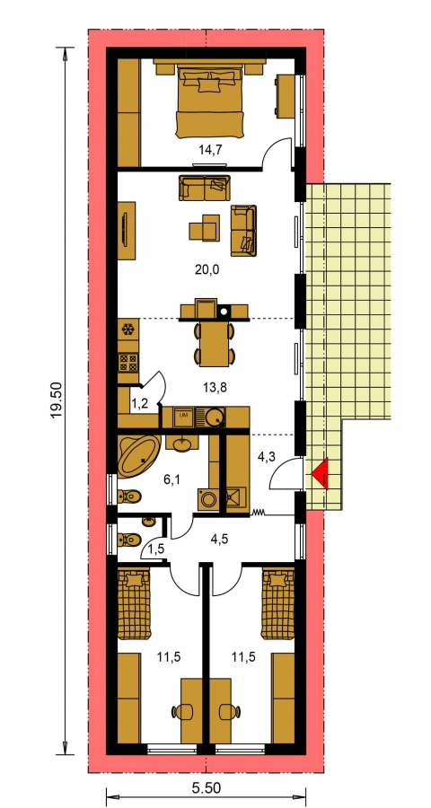The house on the narrow plot Bungalow 136 will fulfil the demands of housing for four people. The front door of the house leads to the entrance hall. Its floor space allows you to select the usual hallway furniture with hangers and shoe cupboards. You can also choose a spacious built-in wardrobe. There is also a boiler in the hallway. You can go from it directly to the day part of the house or to the hallway that leads to the two rooms in the night part of the house.