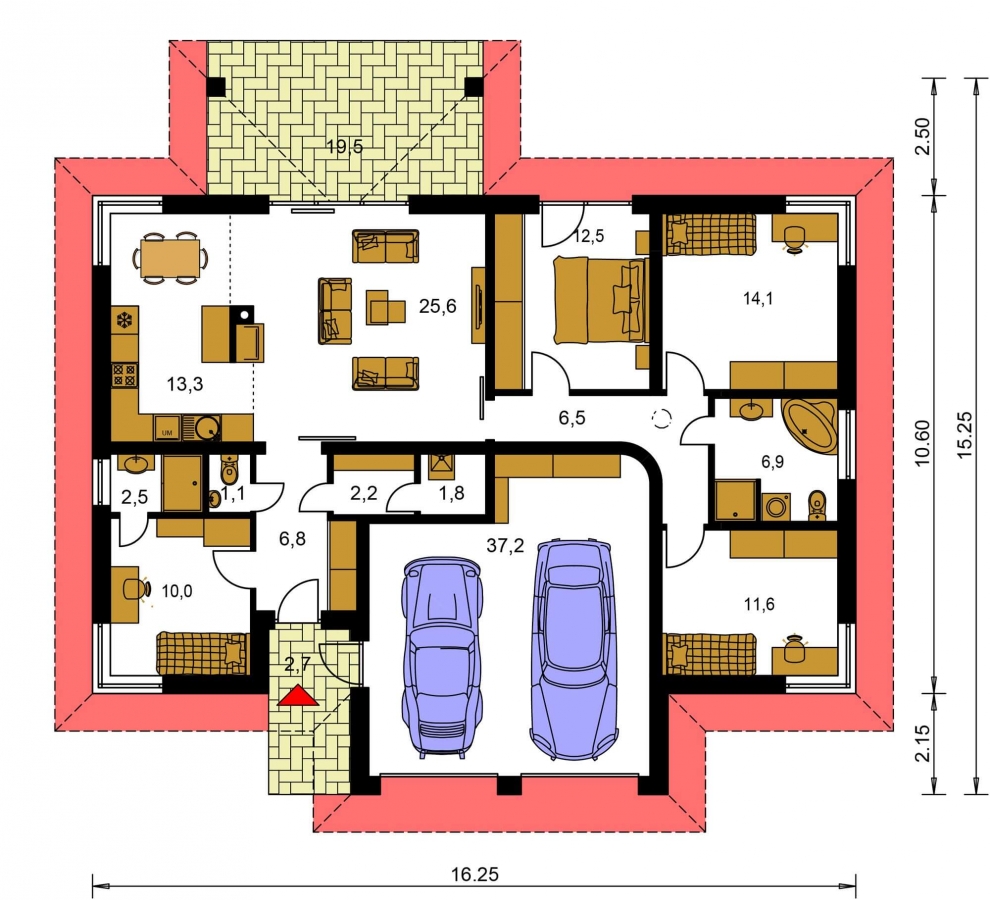 The catalogue project of a house with a double garage Bungalow 137 is suitable for realization on a flat or slightly sloping building plot. This five-bedroom detached house on a wide plot has a two-car garage which has a separate entrance.