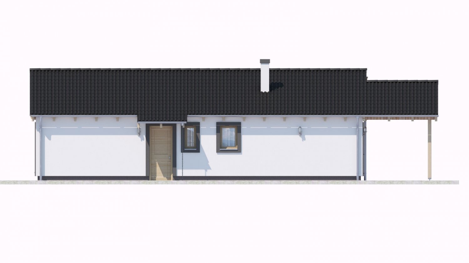 BUNGALOW 139 is a house in the smaller size category, for narrow plots. Suitable for single-storey surrounding buildings. The internal space in this house will meet the housing needs for a 4 member family. The living room and kitchen are separate. The barrier-free design is appropriate for persons with reduced mobility. Suitable for flat and slightly sloped terrain. The house has a fireplace which provides heat and serves an irreplaceable aesthetic function. Thanks to the room on the ground floor, you can avoid the need to take the stairs.