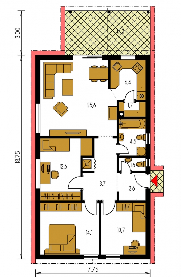 Besides the living room, the house project for a small plot Bungalow 139 has three more habitable rooms. One can serve as a bedroom, the other as a children´s room. There is also a bathroom and a toilet.