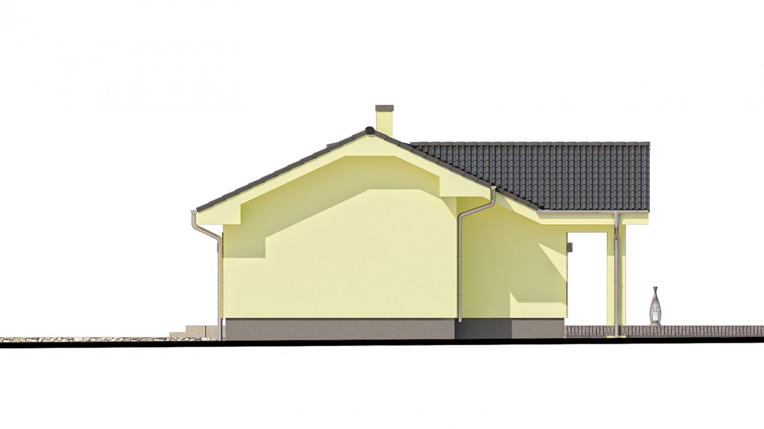 BUNGALOW 146 is a house in the smaller size category, for medium width plots. Suitable for single-storey surrounding buildings. The internal space in this house will meet the housing needs for a 4 member family. The living room and kitchen form a single large space. The barrier-free design is appropriate for persons with reduced mobility. Suitable for flat and slightly sloped terrain. The house has a fireplace which provides heat and serves an irreplaceable aesthetic function. Thanks to the room on the ground floor, you can avoid the need to take the stairs. Suitable for row construction thanks to its shape and layout.