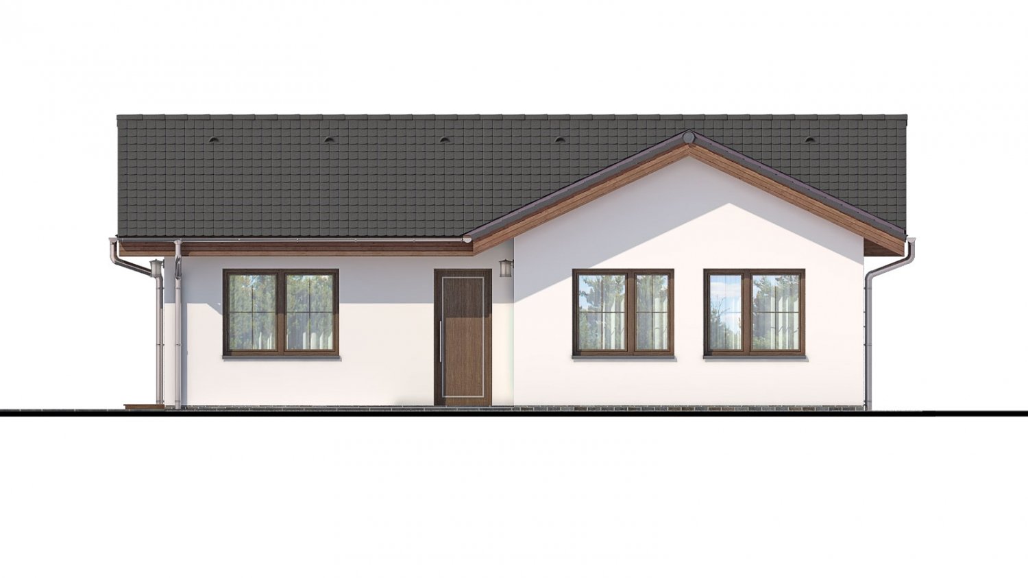 BUNGALOW 160 is a house in the smaller size category, for medium width plots. Living area separate from bedrooms. Suitable for single-storey surrounding buildings. The internal space in this house will meet the housing needs for a 4 member family. The living room and kitchen are separate. The barrier-free design is appropriate for persons with reduced mobility. Suitable for flat and slightly sloped terrain. Thanks to the room on the ground floor, you can avoid the need to take the stairs. Suitable for row construction thanks to its shape and layout.