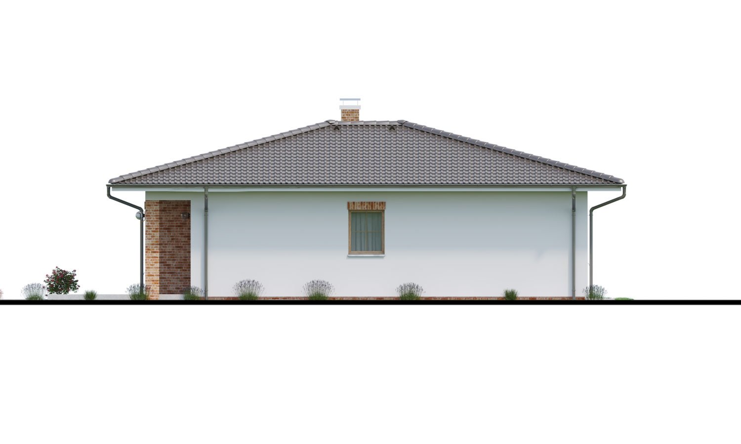 BUNGALOW 197 is a house in the smaller size category, for medium width plots. Suitable for single-storey surrounding buildings. The internal space in this house will meet the housing needs for a 3 member family. The living room and kitchen form a single large space. The barrier-free design is appropriate for persons with reduced mobility. Suitable for flat and slightly sloped terrain. The house has a fireplace which provides heat and serves an irreplaceable aesthetic function. Thanks to the room on the ground floor, you can avoid the need to take the stairs.