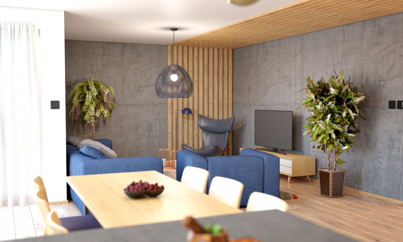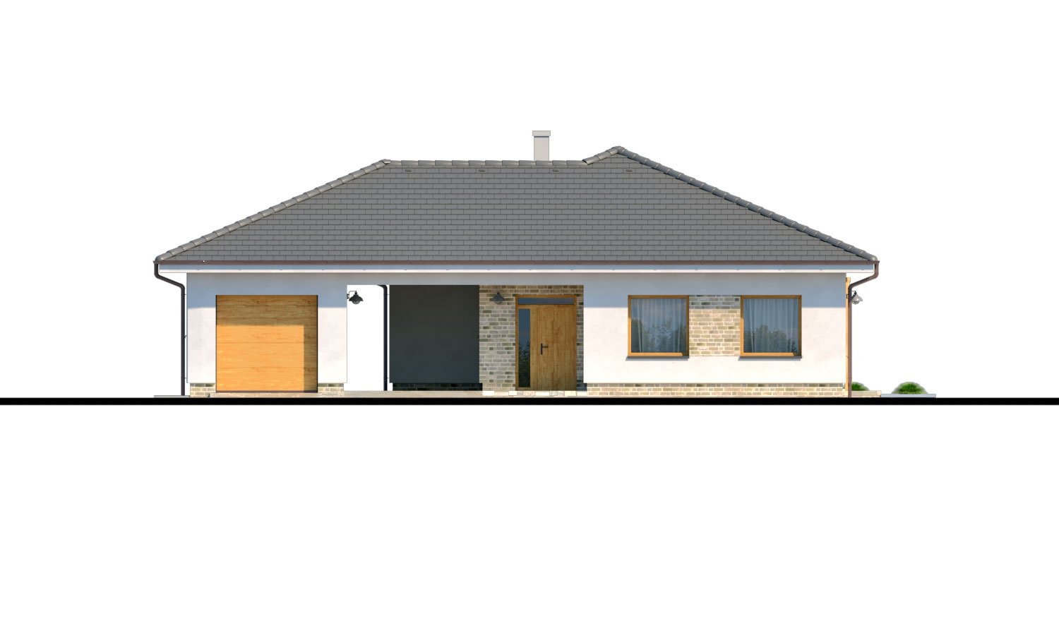 BUNGALOW 202 is a house in the medium size category, for wider plots. Suitable for single-storey surrounding buildings. The internal space in this house will meet the housing needs for a 4-5 member family. The living room and kitchen form a single large space. The barrier-free design is appropriate for persons with reduced mobility. Suitable for flat and slightly sloped terrain. The house has a fireplace which provides heat and serves an irreplaceable aesthetic function. The house includes a spacious garage for two cars. Thanks to the room on the ground floor, you can avoid the need to take the stairs. Suitable for row construction thanks to its shape and layout.