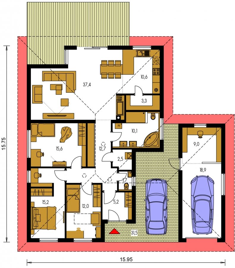 Are you looking for a catalogue project of a family house where you would have an additional parking space in addition to the garage? This modern 4-room brick house with a garage is designed with a separate parking space for a car. This catalogue house project also impresses with a spacious living area with a fireplace. There is plenty of storage space.