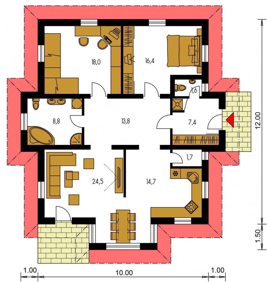 The catalogue project of the house Bungalow 7, as well as other projects from the PRODOM Company, separates the layout into a day and a night part. The roofed house entrance leads you to a spacious entrance hall, separated from the rest of the house with a door. This solution prevents cold from entering the house and saves your heating expenses.