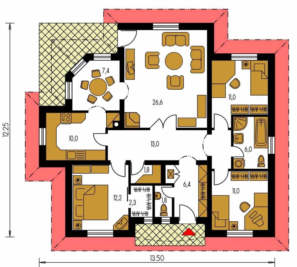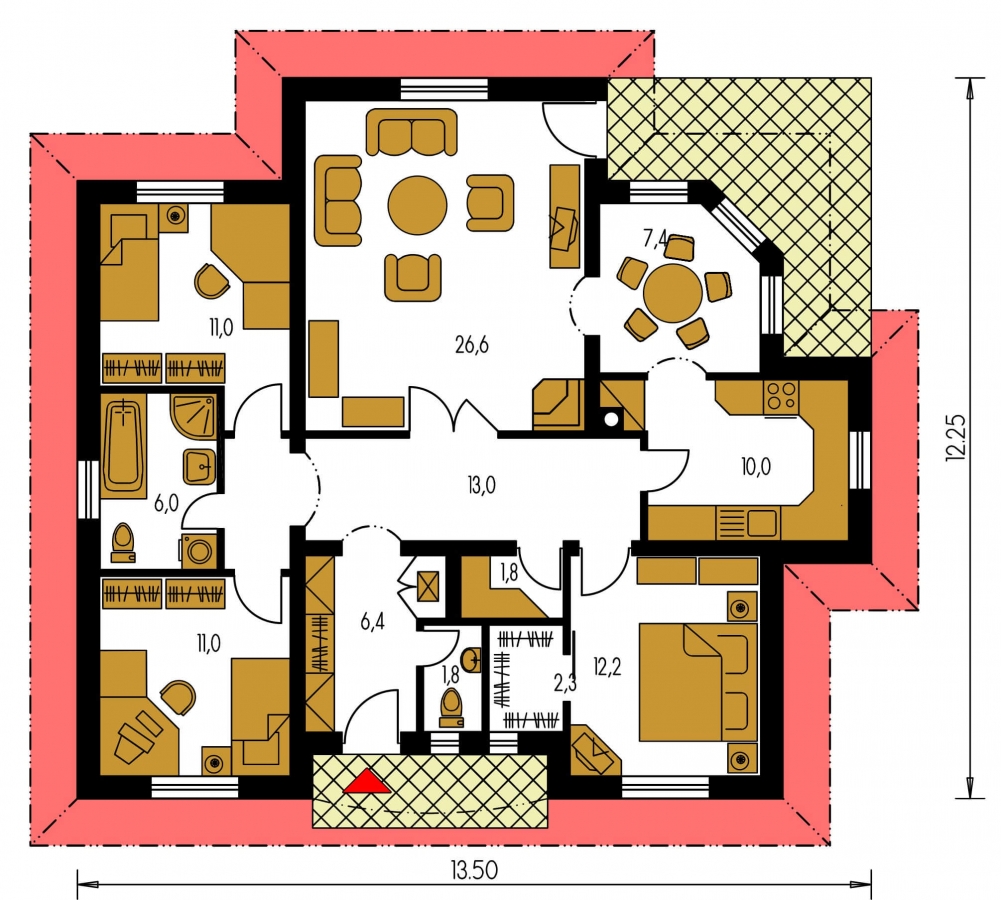 The layout of the bungalow separates the day and night parts by a corridor. This solution will give you more peace and quiet during rest, and your privacy will surely be appreciated by children.