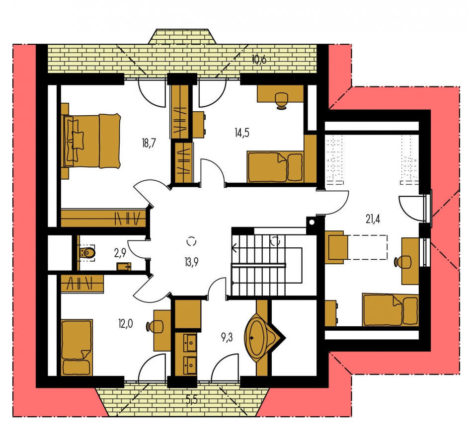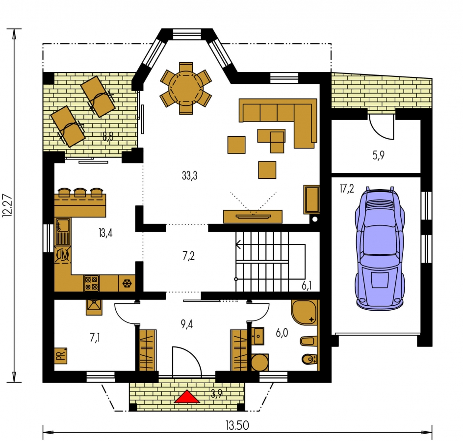 KLASSIK 127 is a house in the larger size category, for wider plots. Living area separate from bedrooms. Suitable for two-storey surrounding buildings The internal space in this house will meet the housing needs for a 5-6 member family. The living room and kitchen are separate. Suitable for flat and slightly sloped terrain. The house has a fireplace which provides heat and serves an irreplaceable aesthetic function. The house includes a spacious garage. Thanks to the room on the ground floor, you can avoid the need to take the stairs.