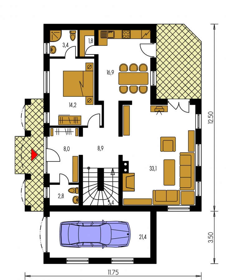 KLASSIK 128 is a house in the larger size category, for wider plots. Living area separate from bedrooms. Suitable for two-storey surrounding buildings The internal space in this house will meet the housing needs for a 6-8 member family. The living room and kitchen are separate. Suitable for flat and slightly sloped terrain. The house has a fireplace which provides heat and serves an irreplaceable aesthetic function. The house includes a spacious garage. Thanks to the room on the ground floor, you can avoid the need to take the stairs. This family house has a basement.