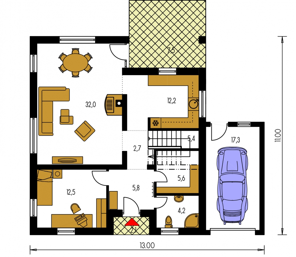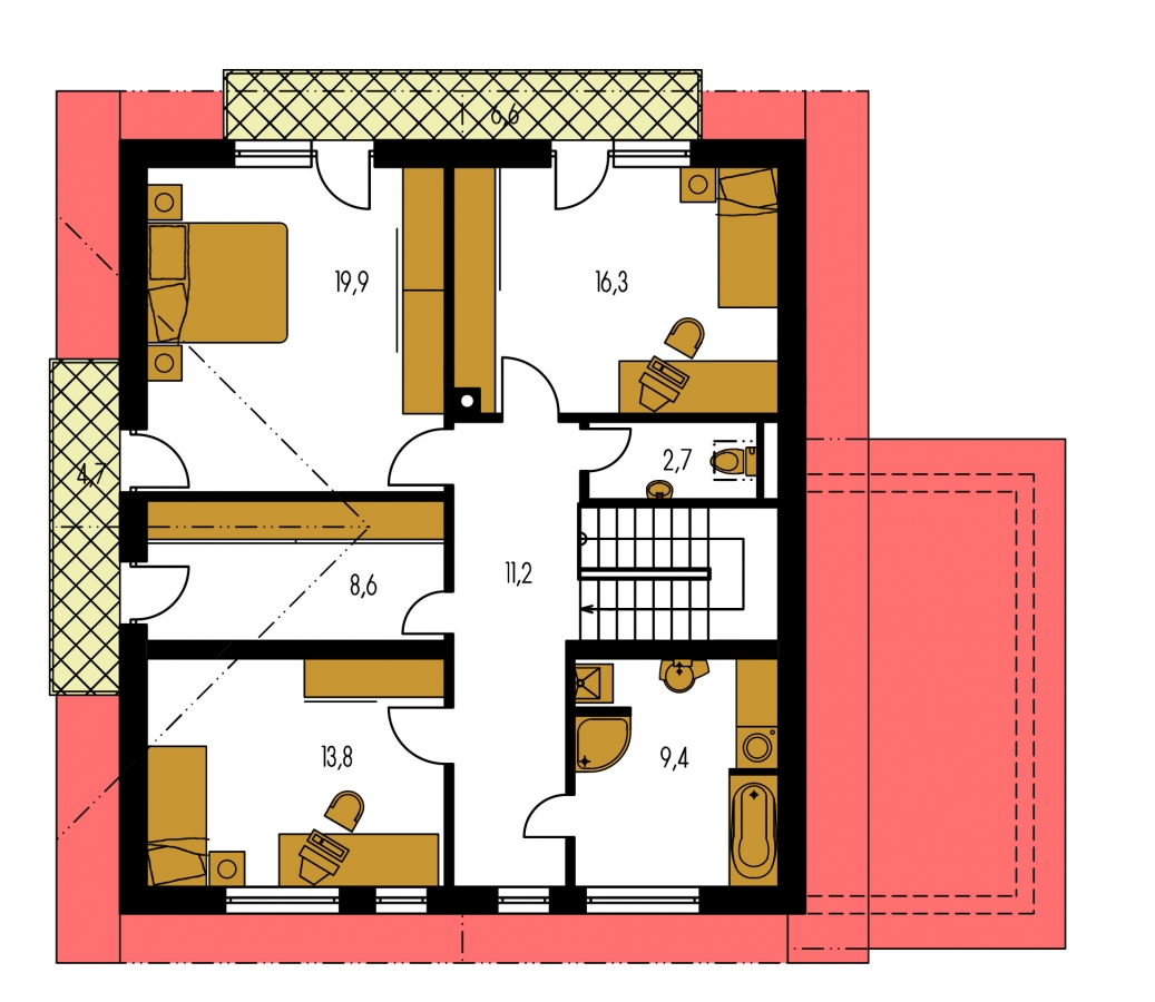 You can create a semi-detached family house by connecting two suitable family house projects. One of them is mirrored to the other. Houses may be single or multi-storey, but they can only be connected via the walls without windows. Any windows in the wall may be eliminated or moved to another side.