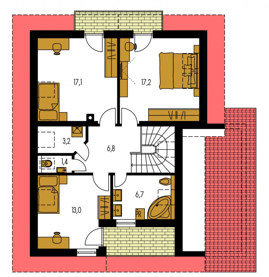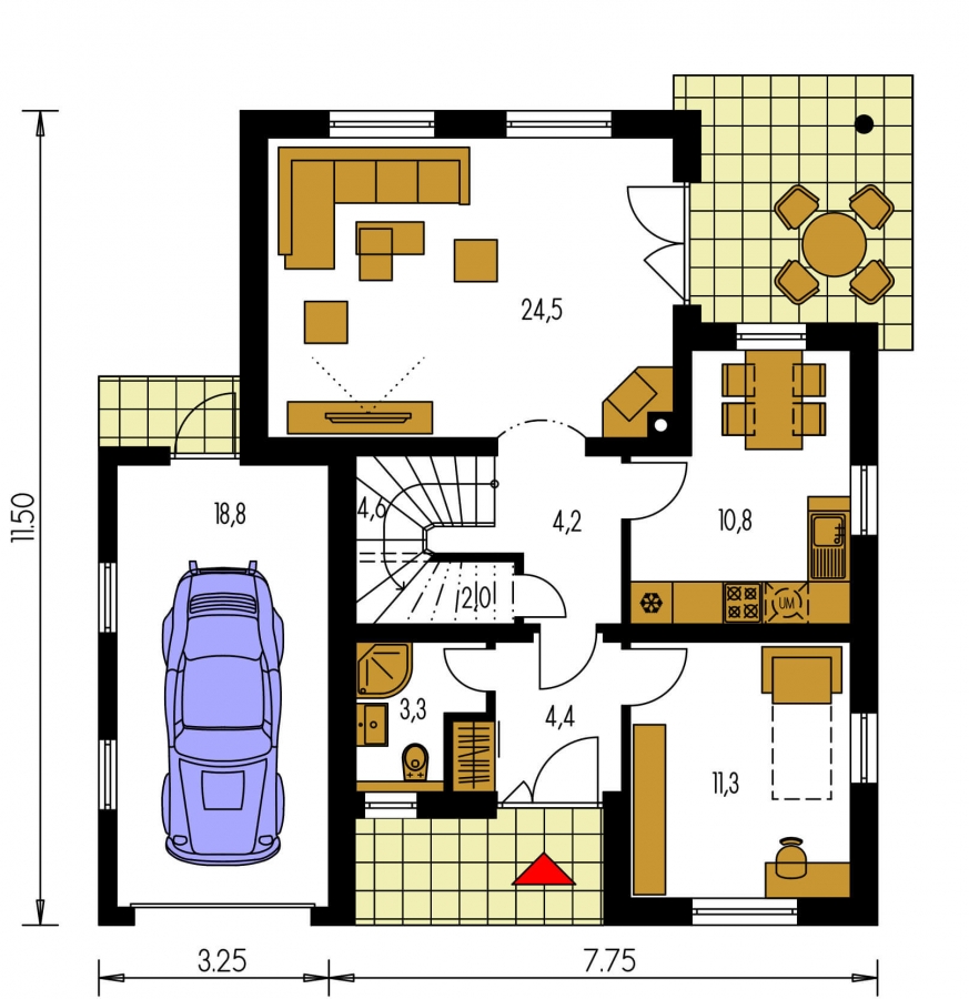 KLASSIK 153 is a house in the larger size category, for medium width plots. Living area separate from bedrooms. Suitable for two-storey surrounding buildings The internal space in this house will meet the housing needs for a 5-6 member family. The living room and kitchen are separate. Suitable for flat and slightly sloped terrain. The house has a fireplace which provides heat and serves an irreplaceable aesthetic function. The house includes a spacious garage. Thanks to the room on the ground floor, you can avoid the need to take the stairs.