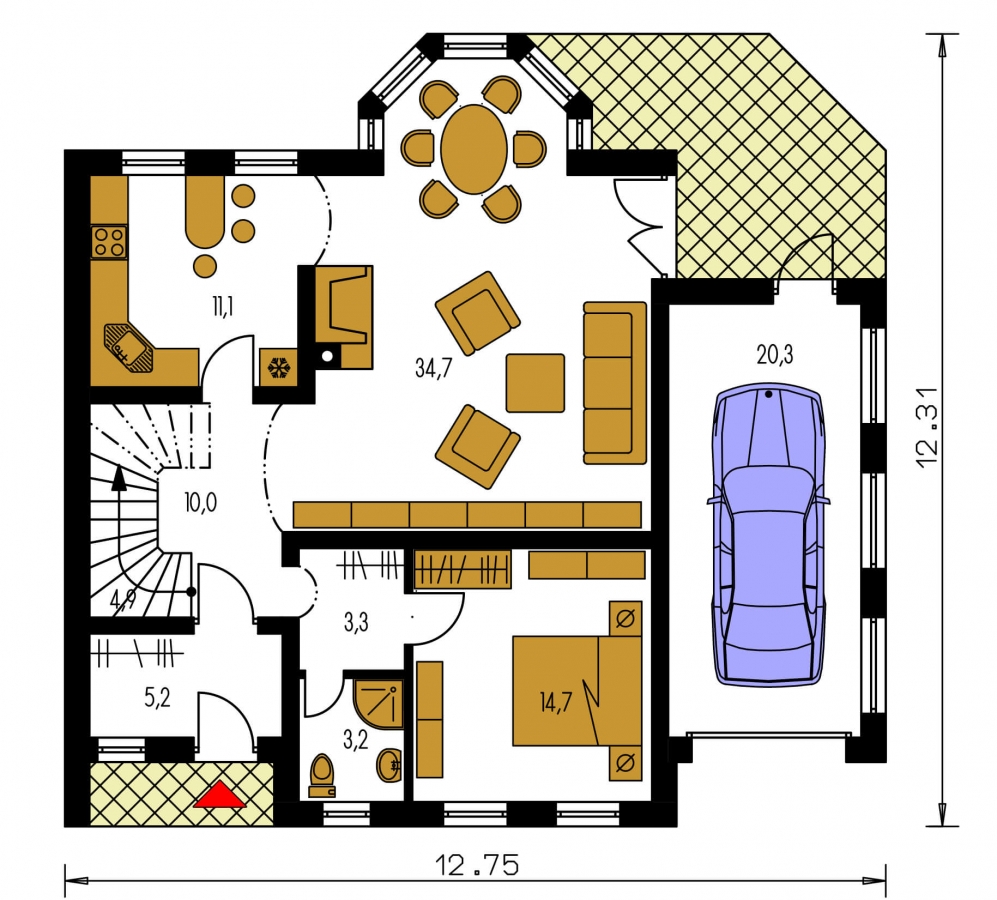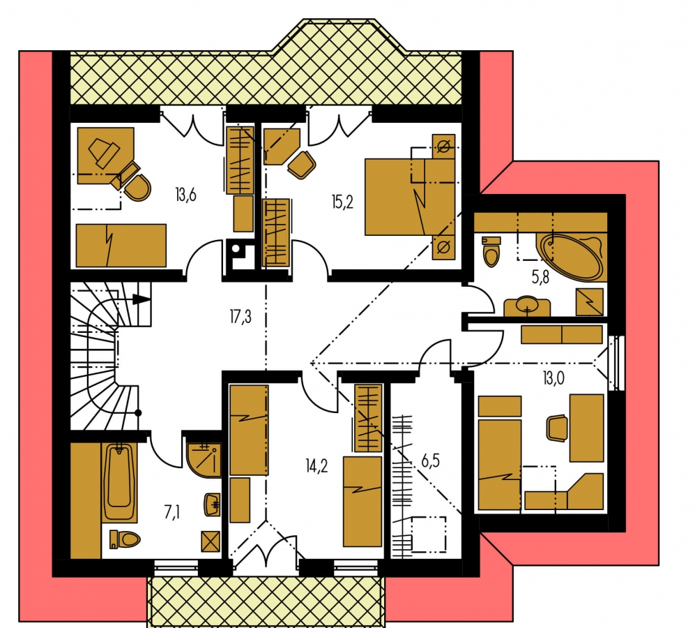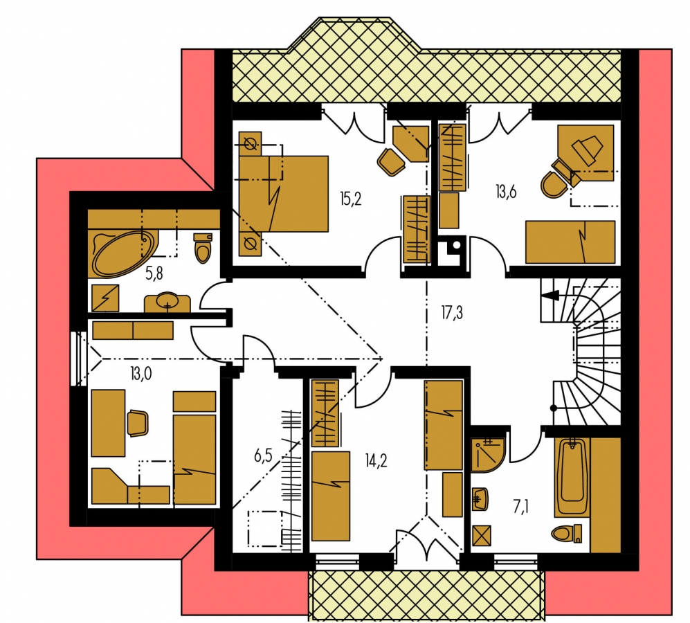 KLASSIK 154 is a house in the larger size category, for medium width plots. Living area separate from bedrooms. Suitable for two-storey surrounding buildings The internal space in this house will meet the housing needs for a 5-8 member family. The living room and kitchen are separate. Suitable for flat and slightly sloped terrain. The house has a fireplace which provides heat and serves an irreplaceable aesthetic function. The house includes a spacious garage. Thanks to the room on the ground floor, you can avoid the need to take the stairs.