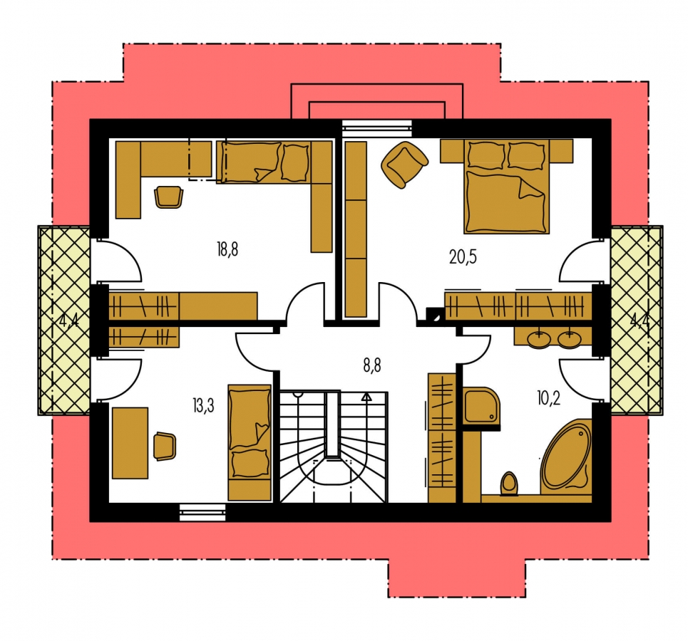 KLASSIK 158 is a house in the medium size category, for medium width plots. Suitable for two-storey surrounding buildings The internal space in this house will meet the housing needs for a 5 member family. The living room and kitchen form a single large space. Suitable for flat and slightly sloped terrain. The house has a fireplace which provides heat and serves an irreplaceable aesthetic function. Thanks to the room on the ground floor, you can avoid the need to take the stairs.