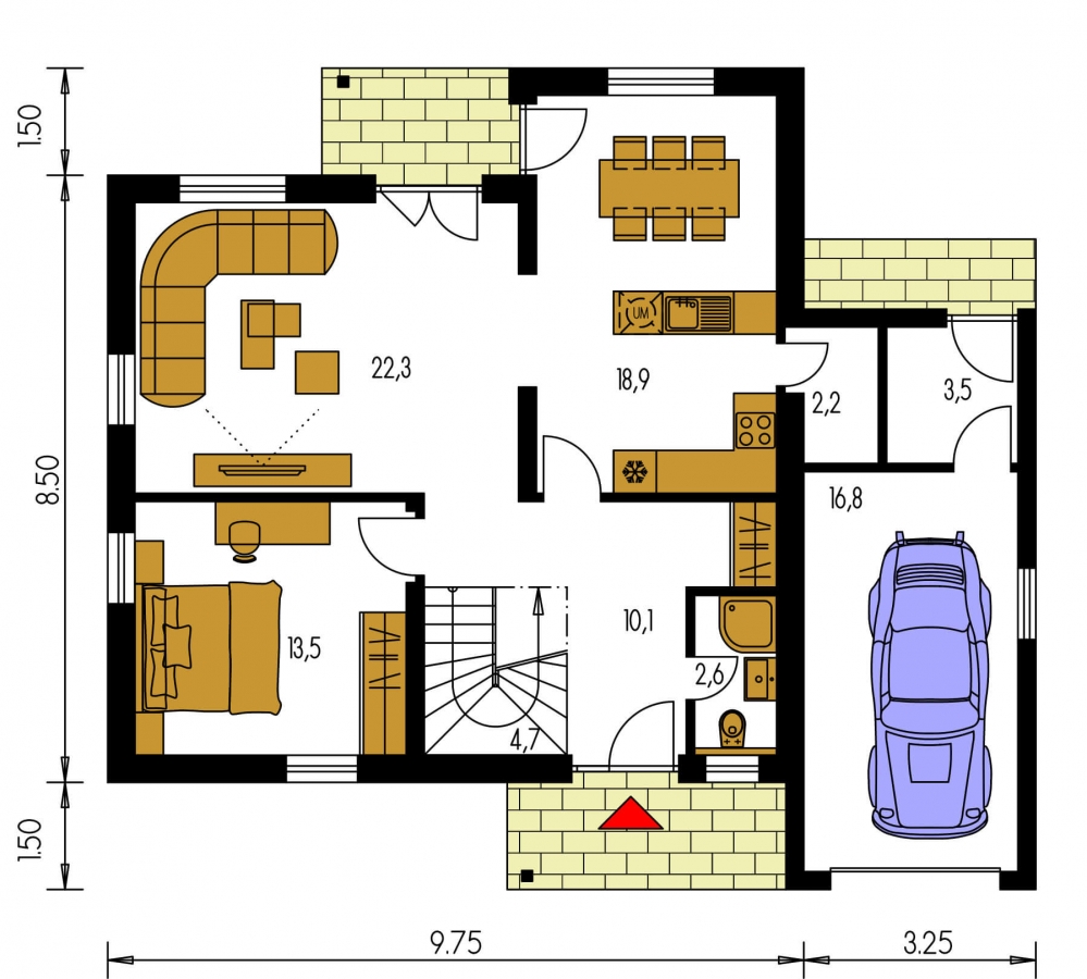 KLASSIK 159 is a house in the larger size category, for medium width plots. Living area separate from bedrooms. Suitable for two-storey surrounding buildings The internal space in this house will meet the housing needs for a 5-6 member family. The living room and kitchen are separate. Suitable for flat and slightly sloped terrain. The house includes a spacious garage. Thanks to the room on the ground floor, you can avoid the need to take the stairs. Suitable for row construction thanks to its shape and layout.