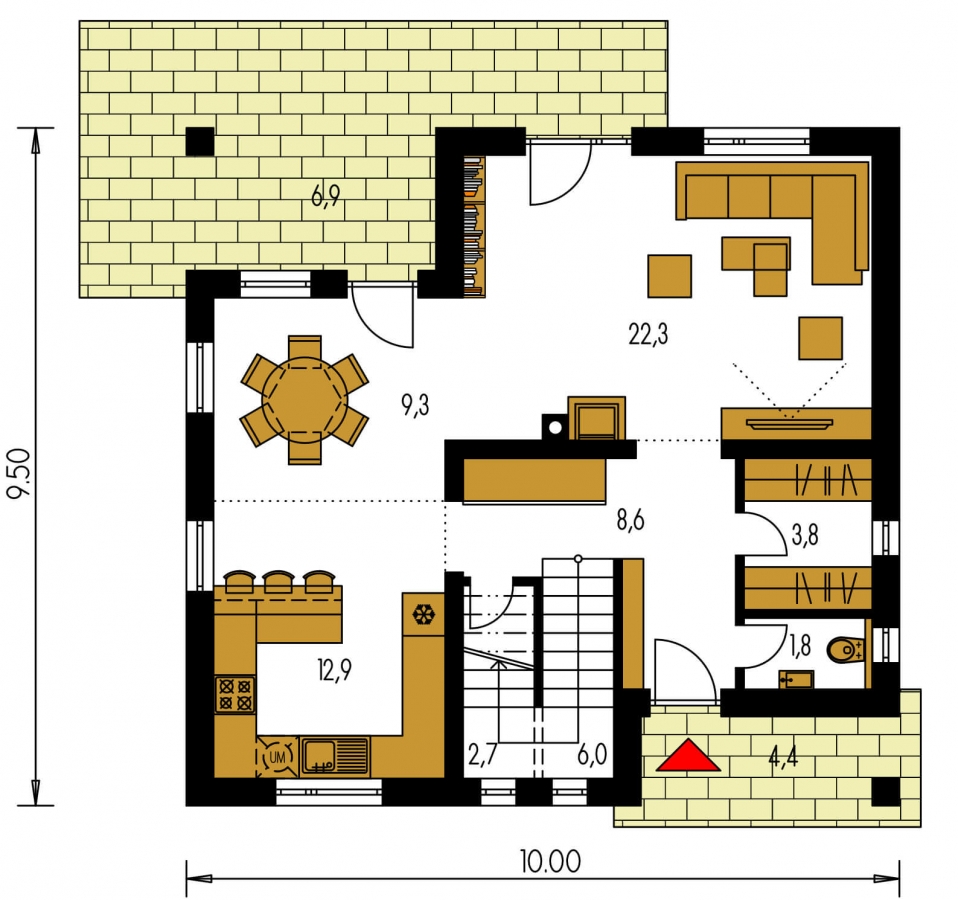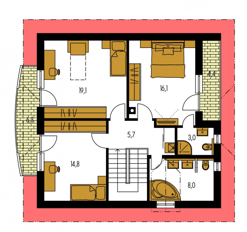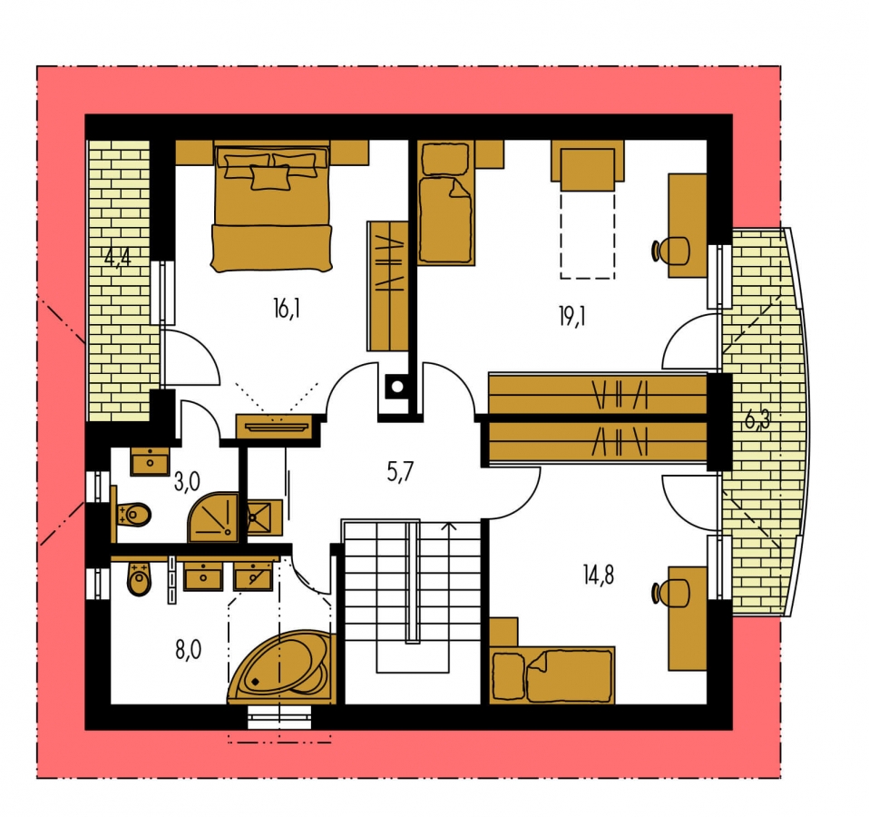 KLASSIK 163 is a house in the medium size category, for medium width plots. Suitable for two-storey surrounding buildings The internal space in this house will meet the housing needs for a 5-6 member family. The living room and kitchen form a single large space. Suitable for flat and slightly sloped terrain. The house has a fireplace which provides heat and serves an irreplaceable aesthetic function.