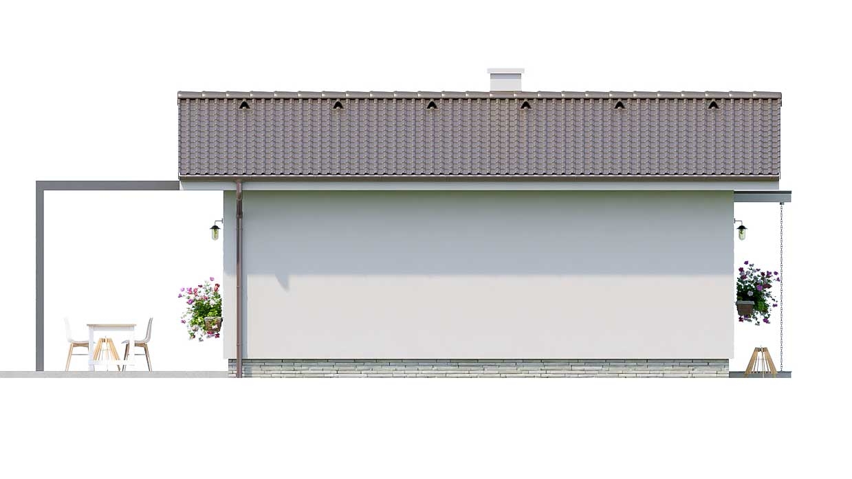 The project of a bungalow without a garage will satisfy the requirements of a family of 2 - 3 members. For parking, there is a reserved space next to the house. A parking space can be built with a roof. This small family house is suitable for realization on flat or slightly sloping land and as a holiday cottage.