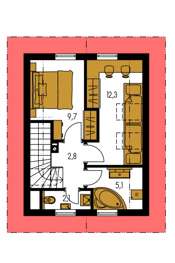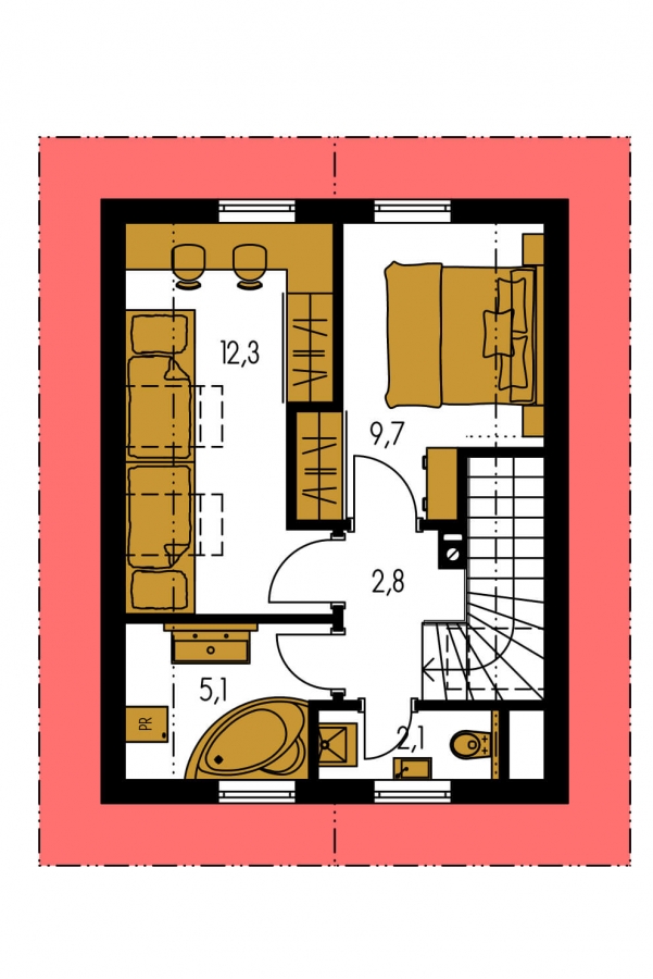 The floor of the small family house ZEN 2 is the night part of the house. There is a bedroom and a children's room for two children. Both rooms are designed with an emphasis on maximum use of storage space and the possibility of placing a built-in wardrobe. A chest of drawers or a shelving unit can also complement bedroom furnishings.