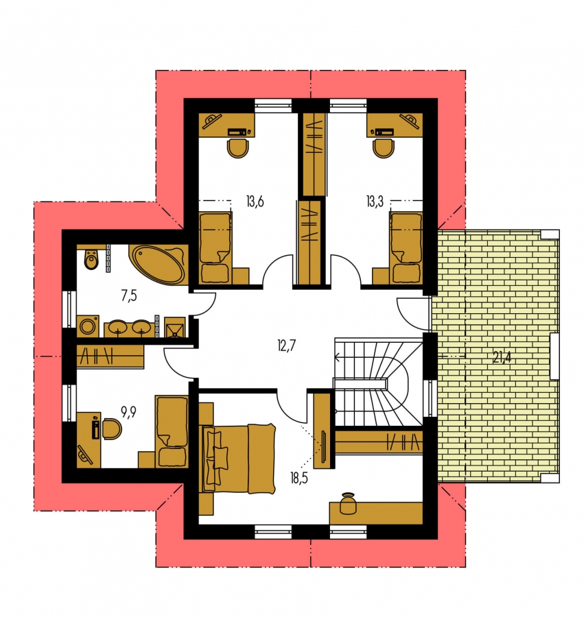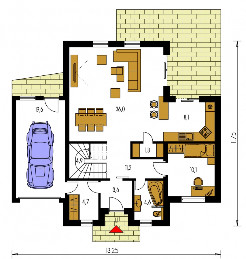 PREMIER 156 is a house in the larger size category, for medium width plots. Suitable for two-storey surrounding buildings The internal space in this house will meet the housing needs for a 6 member family. The living room and kitchen form a single large space. Suitable for flat and slightly sloped terrain. The house includes a spacious garage. Thanks to the room on the ground floor, you can avoid the need to take the stairs. Suitable for row construction thanks to its shape and layout.