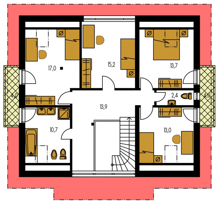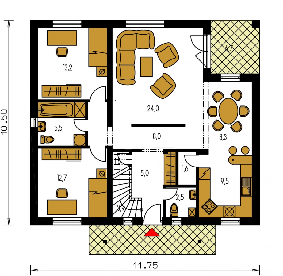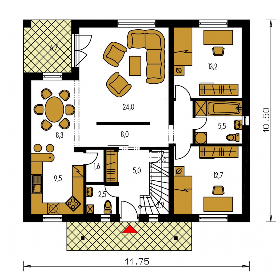 PREMIER 175 is a house in the larger size category, for medium width plots. Suitable for two-storey surrounding buildings The internal space in this house will meet the housing needs for a 6-7 member family. The living room and kitchen form a single large space. Suitable for flat and slightly sloped terrain. Thanks to the room on the ground floor, you can avoid the need to take the stairs.