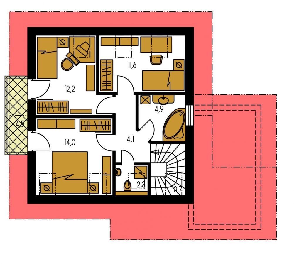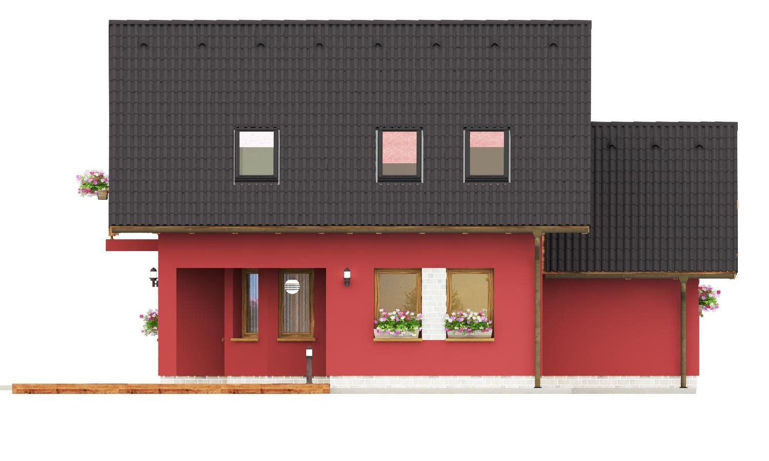 You can create a semi-detached family house by connecting two suitable family house projects. One of them is mirrored to the other. Houses may be single or multi-storey, but they can only be connected via the walls without windows. Any windows in the wall may be eliminated or moved to another side.