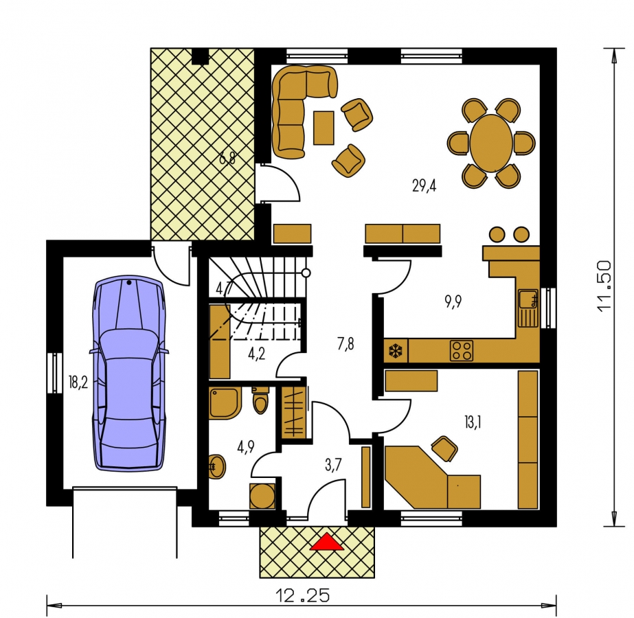PREMIER 65 is a house in the larger size category, for medium width plots. Suitable for two-storey surrounding buildings The internal space in this house will meet the housing needs for a 5-6 member family. The living room and kitchen form a single large space. Suitable for flat and slightly sloped terrain. The house includes a spacious garage. Thanks to the room on the ground floor, you can avoid the need to take the stairs.