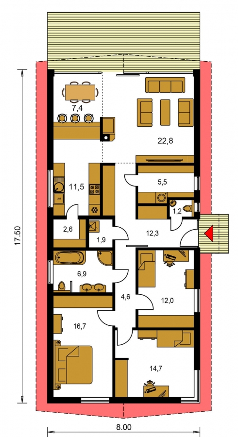 The catalogue house Bungalow 168 fulfils the requirements for housing for four people. The layout of the bungalow divides this house on a narrow plot into a day and night zone. The positioning of the individual rooms will thus bring enough privacy for each member of the household.