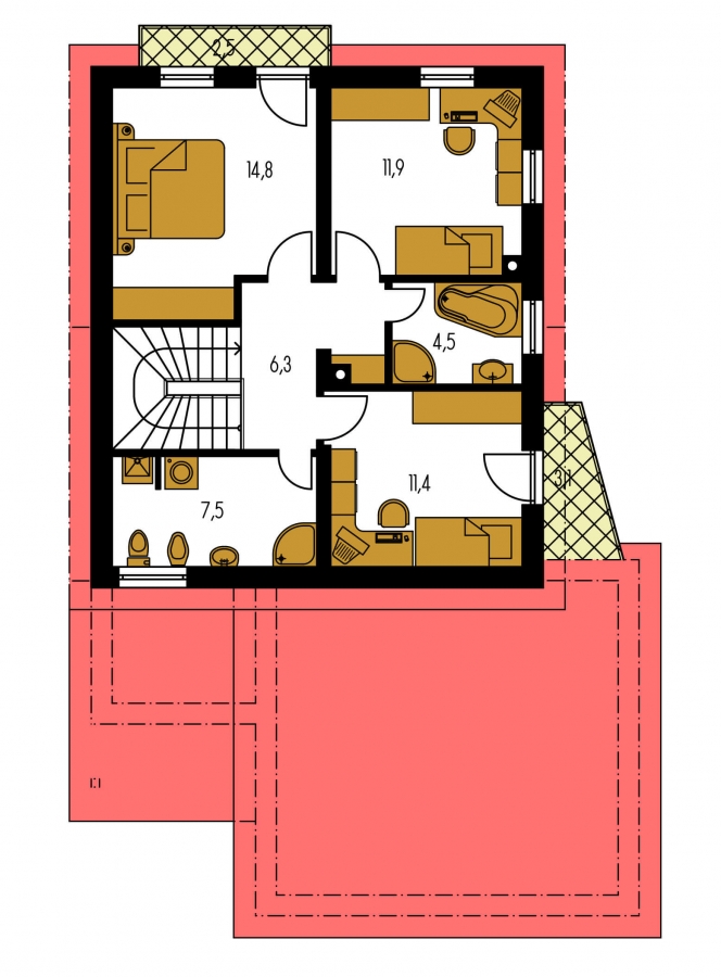 You can create a semi-detached family house by connecting two suitable family house projects. One of them is mirrored to the other. Houses may be single or multi-storey, but they can only be connected via the walls without windows. Any windows in the wall may be eliminated or moved to another side.