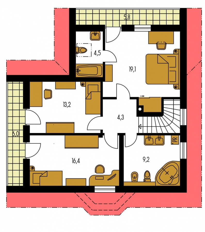 KLASSIK 115 es una casa de tamaño mediano, para parcelas de anchura media. Zona de estar separada de los dormitorios. Adecuada para edificios circundantes de dos plantas. El espacio interno de esta casa satisface las necesidades de una familia de 4-5 miembros. El salón y la cocina están separados. Adecuada para terrenos planos y ligeramente inclinados. La casa cuenta con una chimenea que proporciona calefacción y, además, tiene una función estética irreemplazable.