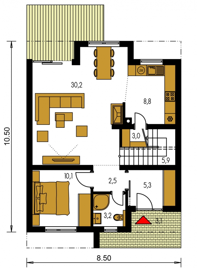 La casa en una casa adosada sin garaje RAD 1 está diseñada para 6 - 7 personas. Se puede construir en una parcela llana o con poca pendiente . El estacionamiento se puede organizar frente a la entrada con un techo.