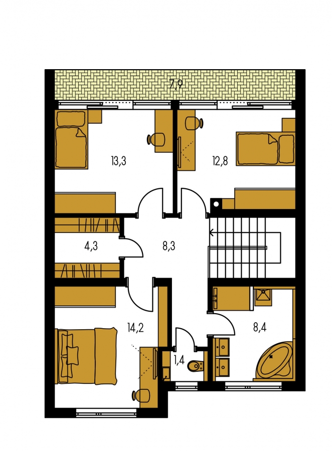 La mayor de las estancias está dedicada al dormitorio. Está separado de las habitaciones de los niños por un pasillo para una mayor privacidad. En el dormitorio le agradará la posibilidad de colocar un armario empotrado y un gran sistema de estanterías para libros o cómodas, si es necesario, aquí también puede caber un rincón de trabajo más pequeño.