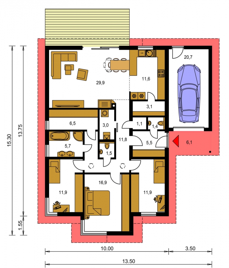 Das Bungalowprojekt Bungalow 178 erfüllt die Bedürfnisse nach Wohnraum für vier Personen. Dieses 4-Zimmer-Haus mit Garage ist in einen Tag- und einen Nachtteil aufgeteilt. Das Wohnzimmer ist mit der Küche verbunden . Im Nachtteil des Hauses befinden sich neben den Schlafzimmern auch ein Badezimmer, eine Toilette und ein Kleiderschrank. Die Garage für ein Auto hat einen separaten Eingang von außen.
