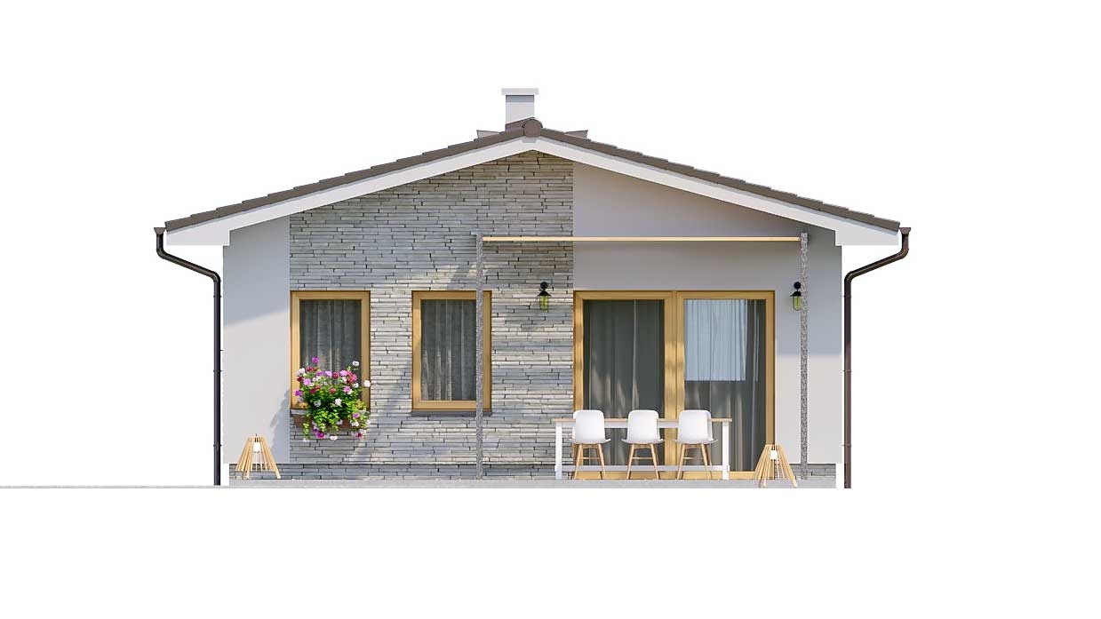 Le projet d'un bungalow sans garage satisfera les exigences d'une famille de 2 à 3 personnes. Pour le stationnement, il y a un espace réservé à côté de la maison. Une place de parking peut être construite avec un toit. Cette petite maison familiale peut être réalisée sur un terrain plat ou légèrement en pente et comme gîte.