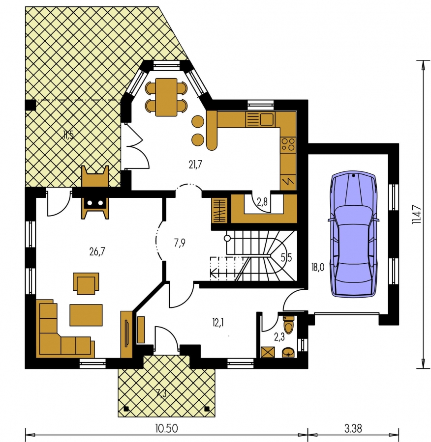 KLASSIK 125 BRNO fait partie de la catégorie des grandes maisons, pour terrains à largeur moyenne. Espace de vie séparé des chambres. Adapté aux bâtiments environnants à deux étages. L'espace intérieur de cette maison satisfera les besoins de logement d'une famille de 4-5 personnes. Le salon et la cuisine sont séparés. Adapté aux terrains plats et légèrement inclinés. La maison dispose d'une cheminée qui produit de la chaleur et qui joue un rôle esthétique irremplaçable. La maison comprend un grand garage.