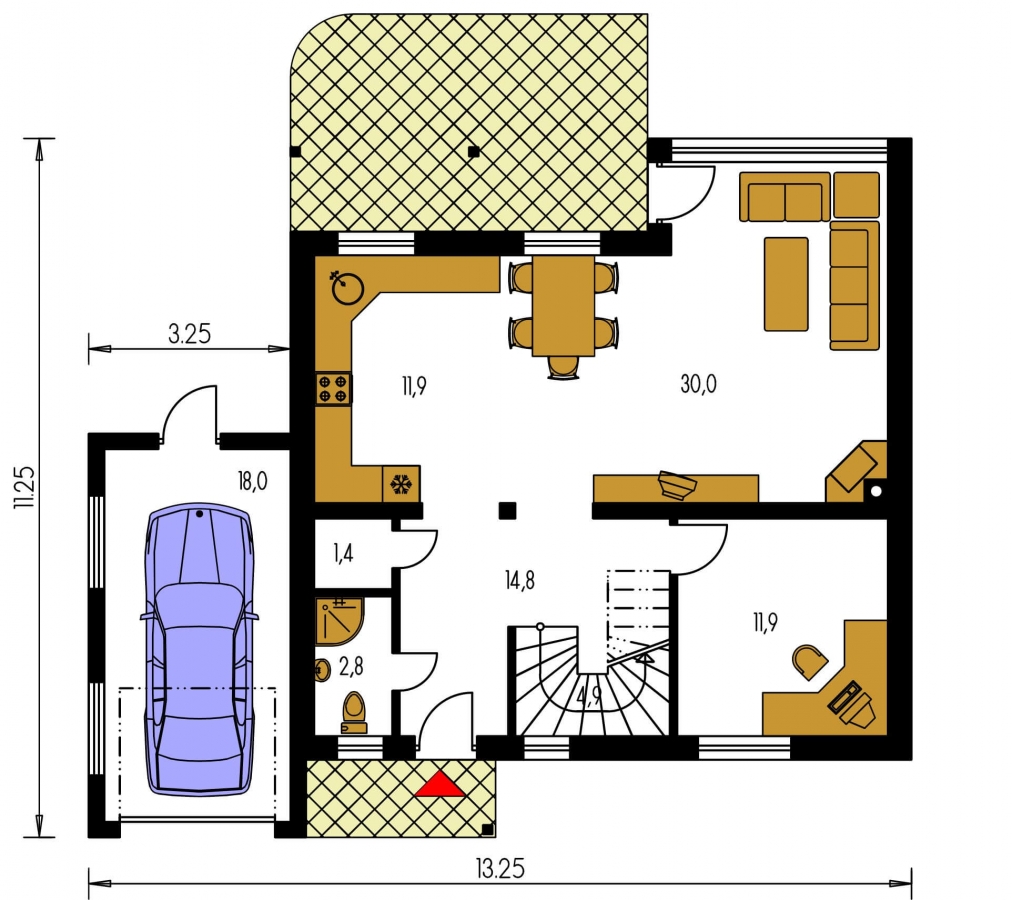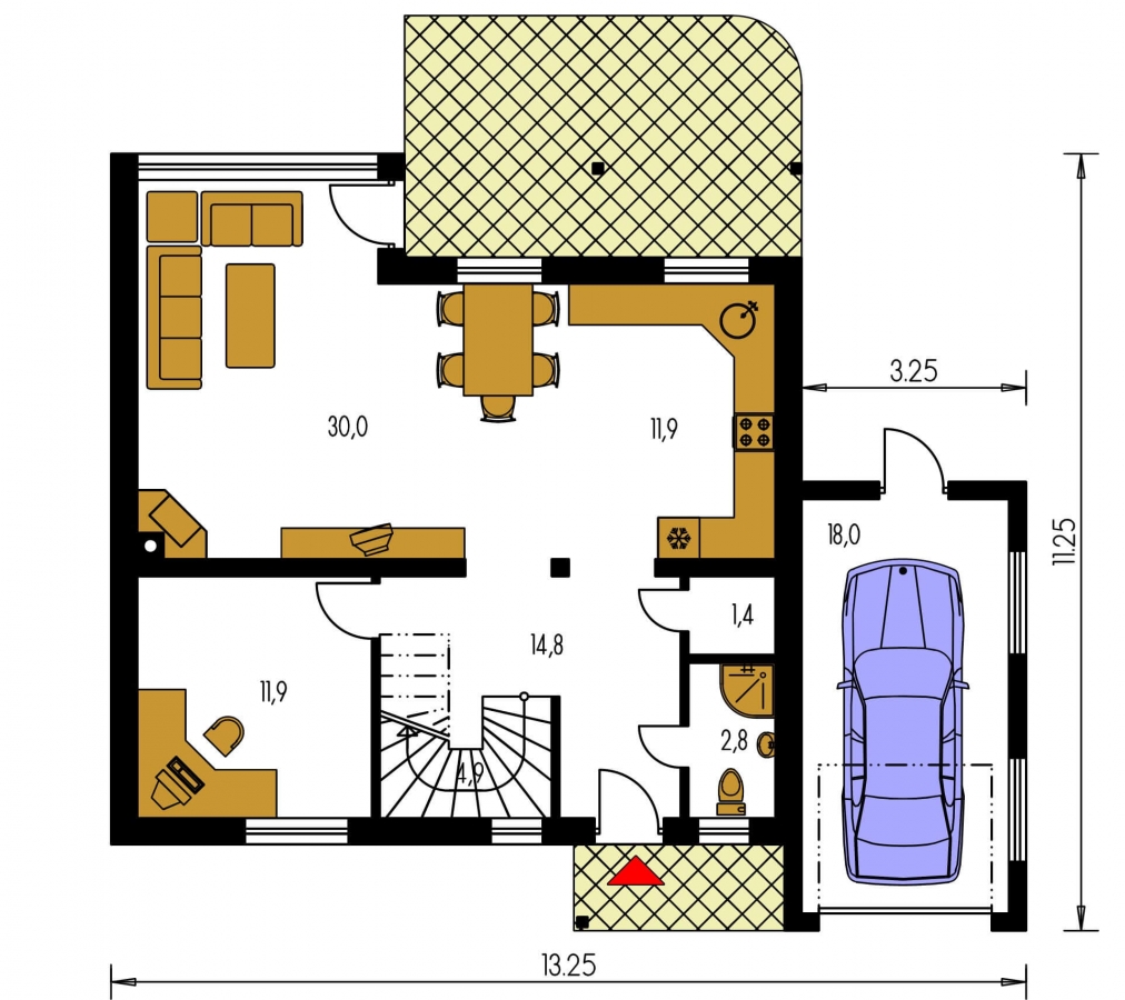 PREMIER 189 fait partie de la catégorie des maisons de taille moyenne, pour terrains à largeur moyenne. Adapté aux bâtiments environnants à deux étages. L'espace intérieur de cette maison satisfera les besoins de logement d'une famille de 5-6 personnes. Le salon et la cuisine forment un seul grand espace. Adapté aux terrains plats et légèrement inclinés. La maison dispose d'une cheminée qui produit de la chaleur et qui joue un rôle esthétique irremplaçable. La maison comprend un grand garage. Vous pouvez éviter de monter les escaliers grâce à la chambre au rez-de-chaussée. Adaptée à la construction mitoyenne grâce à sa forme et à sa disposition.